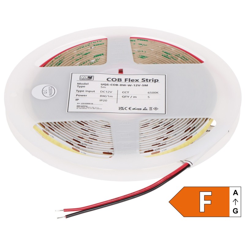 Rated voltage: 12 V DC ; Power consumption: 8 W / 1 m ; Color: White - 6500 K ; Number of LEDs: 320 pcs / 1 m ; Strip length: 5 m ; Application: For indoor use ; Energy class: F ;